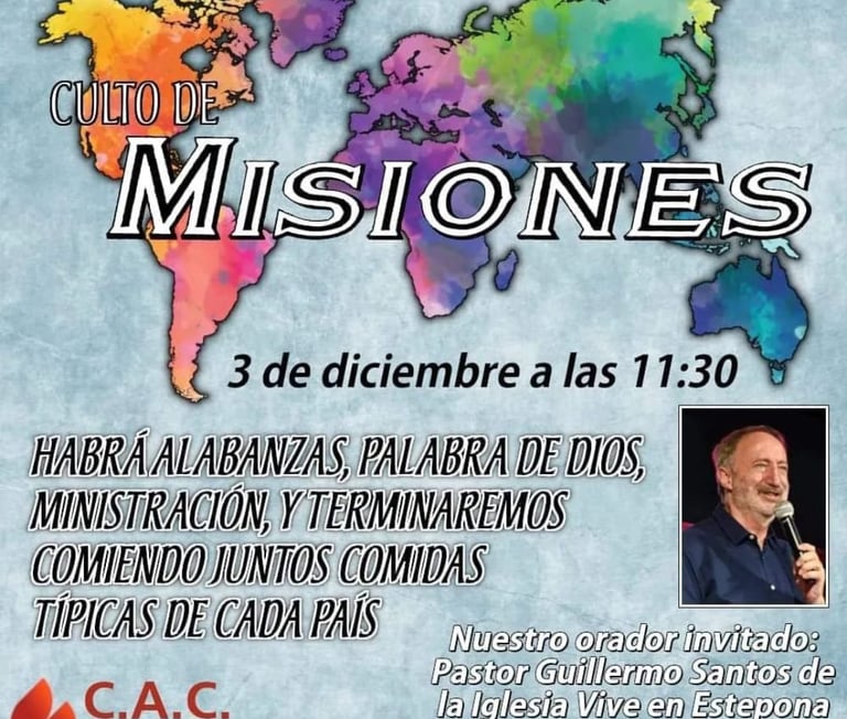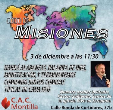 La iglesia C.A.C. Montilla se complace en invitar a todos los fieles a un culto especial de Misiones. Este evento contará con la participación del Pastor Guillermo Santos como orador invitado.